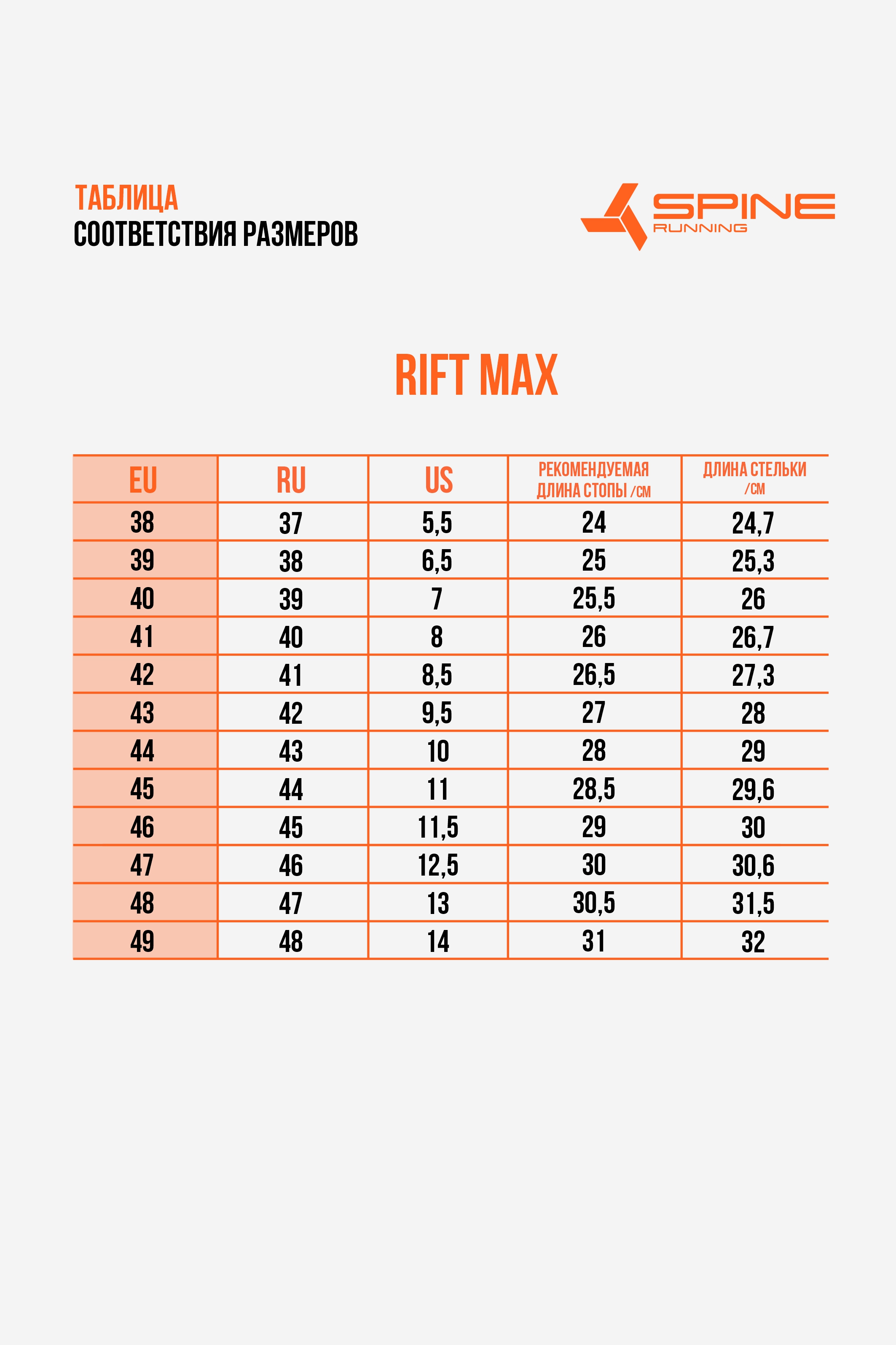 • Размерный ряд – 38–49 (EU).